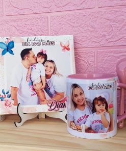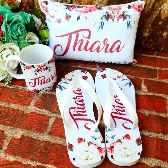 1 almofada 20×30 (poliester) , 1 par de chinelos (mandar via chat a numeração sempre do ímpar para o par ex 39/40), 1 caneca porcelana.