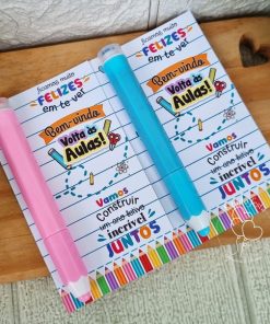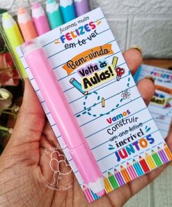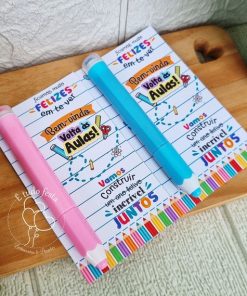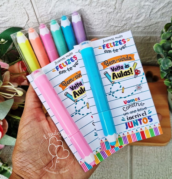 Contem: 1 marca texto em formato de lápis 6 cores diferentes e tag com papel foto glossy 180g.